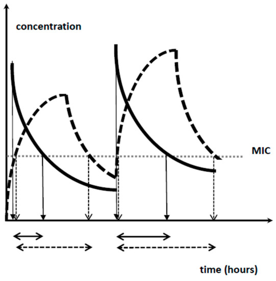Subsequent elimination is almost exclusively by renal elimination, but covers both glomerular filtration as well as renal tubular transport (excretion and absorption). The main factors involved in the development of renal function are gestational age (GA) and the dramatic sequential hemodynamic changes after birth following a fetal setting dominated by high vascular resistance and lower renal blood flow. The postnatal increase is due to the increased cardiac output and the reduced renal vascular resistance, resulting in increased renal blood flow, changes in intra-renal blood flow distribution, and higher permeability of the glomerular membrane [38,39]. This translates in dosing guidelines that consider gestational age or birth weight and postnatal age, as reflected in the dosing regimens for penicillin G (25,000 IU/dose, q6h–8h–12h based on birth weight/gestational and postnatal age) [40], cefazolin (weight and postnatal age) [37], cefotaxime (gestational and postnatal age) [41] and meropenem (20–40 mg/kg, q8h depending on gestational age and MIC) [42]. Interestingly, this last paper also suggested an evaluation of the concept of prolonged infusion. Using this approach, the same 24 h dose exposure will result in a higher time above a given MIC (Figure 1). Recently, this approach (20 or 40 mg/kg, but over 4 h instead of 30 min) has been proven to result in improved survival and faster reduction in inflammation markers in a cohort of 102 neonates with proven Gram-negative sepsis [43].