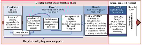 Phase 1: During the modelling phase (2010–2012), we tested the feasibility and acceptability of the first structure in daily clinical practice. For that, we systematically reviewed, retrospectively, more than 500 records of documented inpatient PC consultations, performed by our interprofessional PC team with patients disregarding their disease and their families. We compared and ordered clusters of common themes into the goals of PC [] and discussed any discrepancies among our team until we reached consensus. Through this process, we developed the ‘SENS’-structure.
