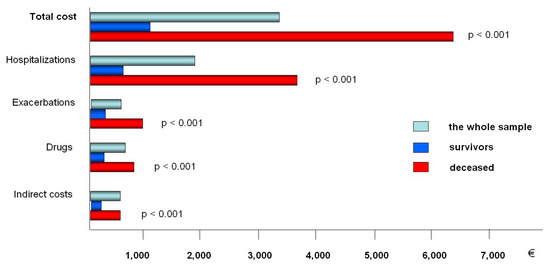 The annual cost-of-illness was then assessed by stratifying the overall cohort by the ultimate outcome (i.e., survival or death) and implemented to the corresponding BODE index (such as the most specific of the previous indices for predicting mortality) during a three-year observation period (Figure 2). The BODE Index, which consists of four components (namely, the body mass index (BMI), the post-bronchodilator FEV1 in % predicted, the dyspnea score measured by the modified MRC scale, and the 6-min walk distance in meters) [3], has been accepted within the scientific community since 2004 as the most specific of all indices usable for predicting mortality.