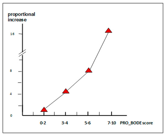 The novel index thus emerging from this study was named the PRO-BODE index, and it was graded according to a specific algorithm, ranging from 0–10 points, as the BODE Index was. When compared to usual indices (such as clinical symptoms, the complete lung function, the components of the BODE index, the Charlson Comorbidity Index, the exacerbation rate, and the hospitalization rate) and to other multidimensional indices presently available (namely, BODE, m-BODE, e-BODE, BODE-x, ADO, DOSE, COPD Prognostic, and SAFE), the PRO-BODE score proved much more strictly proportional to the cost of care and inversely proportional to the patients’ survival at three years. In particular, the PRO-BODE regression power was the strongest (r = −0.58) and also much higher than that of the BODE index (r = −0.21), which was previously the best predictor of mortality [29].