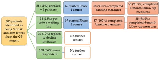 Two GP surgeries were chosen for the pilot. The surgeries were selected on the basis of their capacity to offer staff and room facilities for the pilot. Following group consultation, the following criteria for invitation to the programme were agreed: patients must be over 35 years old, and have a previously recorded BMI of over 30 plus fit into one of the following categories: (1) family history of diabetes; (2) previous raised HbA1c blood result (42–47 mmol inclusive); (3) history of cardiovascular disease; (4) hypertension; (5) history of gestational diabetes or polycystic ovary syndrome; or (6) black or minority ethnic group. These criteria were applied to the patient record at both surgeries by practice staff, and 500 patients were identified. Of these, the first 300 listed were sent letters inviting them to the programme. Mail was generated and sent from within the surgery in order not to breach patient confidentiality. Letters explained to patients how to enroll in the course if they would like to do so, with a range of times on offer.