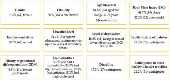Three hundred eligible patients were invited onto the programme by letter. Patients responded quickly to express interest in the groups, and initial group places filled rapidly. Some patients were uncertain why they had been chosen, some objected to receiving a letter, while others welcomed the opportunity to learn more about their risk. As demand exceeded expectation, further groups were organized. In the end, a total of 95 (32%) patients enrolled, and 87 (29%) completed the course to the six-month stage. Four of the attending partners discovered they also met the inclusion criteria, and so enrolled and completed the course to the six-month stage. Figure 1 gives an overview of participant recruitment and retention, while Figure 2 shows the key characteristics of the 99 participants who started the course.