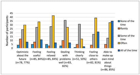 Mental wellbeing was measured using SWEMWBS [19]. Responses were largely positive for each item as shown in Figure 1, with the majority of respondents selecting at least ‘some of the time’. Composite SWEMWBS scores were generated for the 77 participants who responded to at least five of the seven items and so would have a valid score. This gave a mean score of 23.6 for the DDG group compared with 24.6 for the wider population.