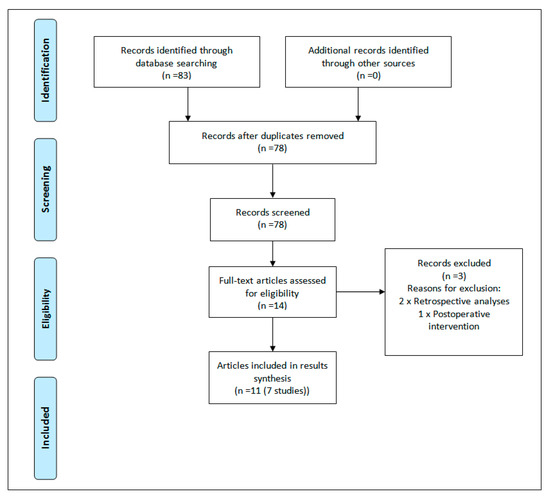 The search generated 83 results, which was reduced to 78 once duplicates were removed. Titles and abstracts of the remaining studies were screened for eligibility, with 64 irrelevant texts removed. Fourteen papers underwent full-text screening, with a further three articles removed. Two papers were removed as they were retrospective analyses [17,18] and one screened patients preoperatively but did not deliver the educational intervention until six weeks after surgery [19]. Secondary searching was undertaken, whereby reference lists of the selected articles were reviewed for additional studies not identified in the primary search, but did not uncover any additional results. The flowchart of the study selection process is presented in Figure 1.