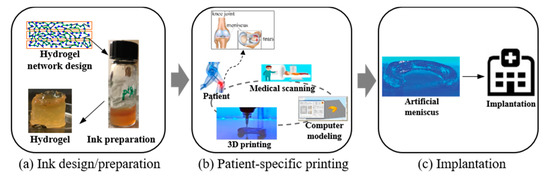 The roadmap for 3D printing of an artificial meniscus is illustrated in Figure 1. First, biomaterials with specific functionalities are designed and prepared, as shown in Figure 1a. The specific dimensions of the patient’s meniscus can be obtained through medical scanning and the computer model of the meniscus will be generated based on the results. Then, the prepared biomaterials are loaded into the cartridge and 3D printing starts. The printed biomaterials will be cross-linked and hydrogels (with a network of insoluble polymers that expand in water) will be formed to secure the dimensions as printed. The printing process is shown in Figure 1b. The printed meniscus will then be implanted in the patient’s body, as shown in Figure 1c.