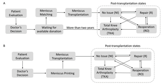 In order to estimate the long-term cost and risk for patients undergoing traditional versus 3DP-enabled meniscus transplantation, we create pathway models of the two types of transplantation, as shown in Figure 2, and simulate a 20-year period of the system to monitor patients in the pathway models. The simulation period is long enough for this study considering that the reported lifespan of a meniscus allograft transplantation ranges from as short as 2 months to as long as 17.3 years [26,27,28]. The short lifespan of meniscus allografts is due to significant varus malalignment after transplantation which requires valgus treatment [26]. In the following, we first describe the pathway model of traditional transplantation and then explain how the 3DP-enabled transplantation model differs.