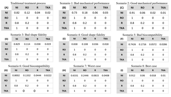 For the simultaneous effect of these three factors, we integrate each factor’s influence on the quality of a 3D-printed meniscus to form two extreme cases (best and worst). Specifically, by multiplying all the probability values in the bad scenarios (i.e., probabilities adjusted to 150%, 95% and 143% for mechanical performance, shape fidelity and biocompatibility, respectively), the worst case (Scenario 7) is obtained where the probabilities of R, RO and TKA are tuned to 203.78%. Similarly, by multiplying all the probability values in the good scenarios (i.e., probabilities adjusted to 50%, 90% and 111% for mechanical performance, shape fidelity and biocompatibility, respectively), the best case (Scenario 8) is obtained where the probabilities of R, RO and TKA are tuned to 49.95%. The corresponding transition matrices are shown in Figure 3H,I.