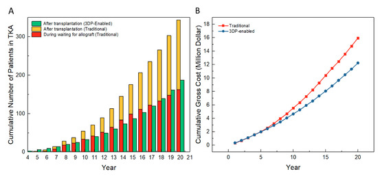 Comparison of traditional and 3DP-enabled meniscus transplantation: (A) Cumulative number of patients in TKA and (B) Cumulative gross cost for patients.