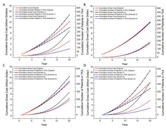 Figure 5 shows the results of the sensitivity analysis on 3DP-enabled transplantation under the eight scenarios given in Figure 3. In each plot, “original” represents the case where the transition matrix is the same as that of traditional transplantation; in other words, the 3D-printed meniscus has a similar quality to the allograft. The number of patients in TKA and the cumulative gross cost for patients are calculated in the “original” case and for the cases representing good or bad quality of a 3D-printed meniscus.
