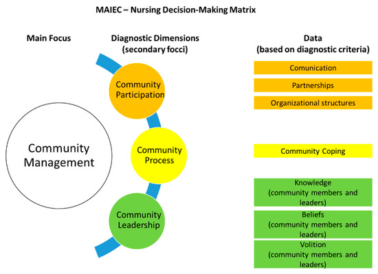 There is a lack of studies on community empowerment in Community Health Nursing. In 2005, Falk-Rafael identified in her study that nurses could promote community empowerment in their practice at the intersection of public policy and personal lives [15]. In addition, a recent study has suggested that community health nurses contribute to the empowerment of Afro-Colombian community leaders by promoting control and social participation according to self-knowledge, organization, community engagement, intersectional work, and expanding project management [16]. In 2013, a report from an Irish Population Health interest group identified community empowerment as an intervention for public health nurses, more specifically concerning the building of coalitions between health professionals and community groups to solve specific community issues, such as improvement in breastfeeding rates [17]. Within the Portuguese political context and national legislation are four main community health nursing skills, one of which is community empowerment. Community empowerment is associated with an approach to CHN in which the community is the unit of nursing care. However, when we analyze the existing conceptual models and theories of nursing, we find that, in the majority of these studies, the community exists as a context of care to individuals and/or families [6,18]. The MAIEC [2,3,4] is a conceptual framework and prescriptive theory that defines the concept of community as a set of people in a defined geographical context with functions that have been identified for its members and for the groups and organizations that they form. It requires a sense of identity that allows for the sharing of common goals. It is also an open system that results from the interaction of individuals, groups, and community organizations. The whole and the parts interact through community participation, leadership, and processes [4]. The MAIEC integrates community empowerment within the definition of community health, describing it as a dynamic process of community empowerment in which community participation, processes, and leadership combine in order to be able to identify and solve problems and mobilize community resources. Community health determinants are related to public health determinants in terms of community empowerment indicators, and enhance the effectiveness of a community intervention from a collaborative perspective [2,4]. In this way, nursing care to the community as a unit is defined by the MAIEC as the development of a collaborative and empowering action by the community that grounds the approach of community management as an enhancer of community health gains sensitive to nursing care. It conceptualizes the community empowerment approach as a process in an integrated and integrative view of the community as a whole and that results in the community’s achieving the highest level of community empowerment [2,3,4]. This model also has a decision-making matrix [2,4], which is based on the ICNP [7], that places a central focus on nursing attention (community management) and three diagnostic dimensions (community participation, community process, and community leadership). Each dimension has specific diagnostic criteria whose satisfaction may lead to a judgment that forms a main nursing diagnosis (e.g., community management commitment) and a secondary diagnosis (e.g., community leadership commitment: knowledge of leaders not demonstrated. The MAIEC was developed from a constructivist perspective using two research techniques: the focus group, which was comprised of Portuguese community health nurses, and the Delphi panel, which was comprised of a population of community health nurses from Portugal [2,3]. Figure 1 shows an illustration of the relation between the nursing focus and data in the MAIEC decision-making matrix.