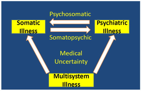 Medical uncertainty is defined as a “subjective perception of an inability to provide an accurate explanation of the patient’s health problem” []. Medical uncertainty is not a diagnosis. Instead, there is always some degree of certainty or uncertainty with any medical condition or diagnosis. There is still much to learn about illness and the brain–body interaction. No medical condition is totally explained or unexplained. Instead, knowledge is on a continuum, and all conditions are partially explained to different degrees []. As a result, some degree of uncertainty always has been, and always will be, a part of medicine. Diseases that are relatively easier to understand present with simpler and more clearly defined causes, pathophysiology, and symptoms. The more challenging diseases are those that are more complex and are often considered more controversial. They have multiple disease contributors, pathophysiology, and symptom presentations with a greater amount of medical uncertainty.