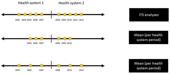 whereby, y is the parameter of interest (either health determinant or health financing domain variables), T is the time component, whereas par is the binary variable indicating the 1997–2007 (valued to be 0) and 2008–2017 (valued to be 1) health systems; ε is the error term representing the uncertainty in the model [17]. The cut off period for the ITS was set at 1997/1998–2007 and 2008–2017/2018. At least five continuous annual data points should be available for the ITS analysis. If the number of continuous data points for each period was less than five or if the data points were not continuous, the mean of the data points was utilized instead; as shown in Figure 2 below.