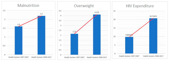 Malnutrition: Prevalence of severe wasting, weight for height (% of children under 5); overweight: prevalence of overweight, weight for height (% of children under 5); HIV expenditure: inflation-adjusted HIV expenditure (in USD millions); mean representation of the selected health determinant (malnutrition and overweight), and health financing (inflation-adjusted HIV expenditure) variables.