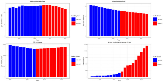 From the health determinants, only TB prevalence had an apparent distinction among the two health system periods, with an apparent decrease in the previous one and a subsequent increase in TB cases in the succeeding health system period. There was no distinct trend for maternal mortality rate, while there was decreasing and increasing trends for infant mortality rate and HIV prevalence, respectively. All the data utilized in this study are reflected in Table S1.