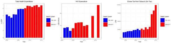 Health financing parameters (total health expenditure, HIV expenditure, tobacco excise tax) in either of the health system periods.