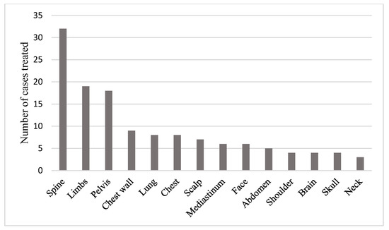 The patient population included 17 subtypes of soft tissue sarcoma and 3 subtypes of bone sarcoma (Figure 1). A total of 15 different anatomical sites were treated with palliative radiotherapy during the time period studied. These are shown in Figure 2. Table 2 and Table 3 shows the details of the radiotherapy dose fractionation schedules delivered, and the radiotherapy techniques used. A total of 25 different dose fractionation schedules were used.