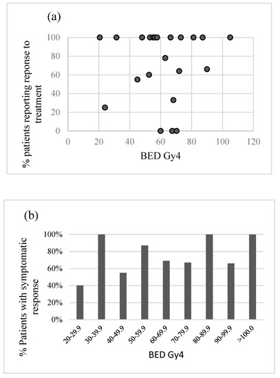 This figure demonstrates symptomatic response based on BED. (a) Demonstrates the response for each separate dose and fractionation regimen, expressed as its BED (Gy4); (b) demonstrates the response for all dose and fractionation regimens with a BED within each given range.