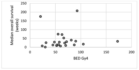 This figure demonstrates the median overall survival of patients plotted against BED for each dose/fractionation regime.