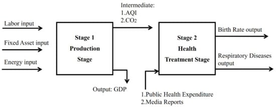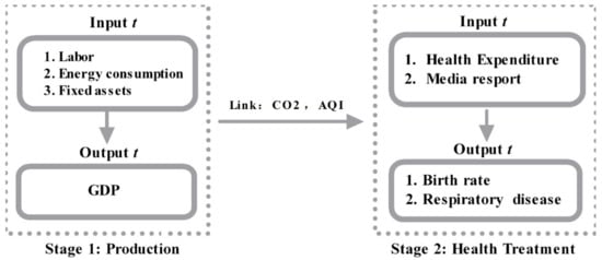 Data from 2013 to 2016 were extracted from the Statistical Yearbooks of China [61], the Demographics and Employment Statistical Yearbooks of China [62], and the Statistical yearbooks from each city. Air pollutant data were collected from China Environmental Protection Bureau reports [3]. The research follows past research on energy and environment, the inputs are labor, fixed assets, and energy consumption (Hu and Wang [59], Wang and Wei [63], Du et al. [64], Li et al. [65]). GDP is desirable output, and CO2 and AQI are undesirable outputs (Yeh et al. [66], Choi et al. [67], Wang et al. [68], Wang and Wei [63]). In the second stage, following Zhang et al. [69], input is health expenditure and output is birth rate. The link variables of two stages are CO2 and AQI, which also followed Zhang et al. [69]. The two-stage model is shown in Figure 2