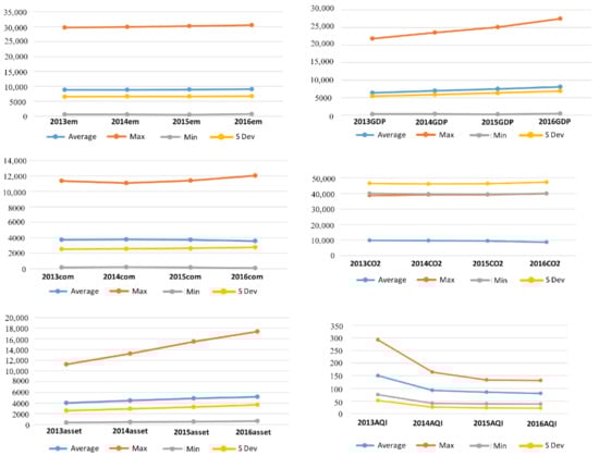The average value of the undesirable carbon dioxide emissions fell in 2016, the maximum dropped in 2015, and then rose again in 2016. The maximum and average AQI reached its highest point in 2013 and then continuously declined. The minimum value decreased in 2016 but was slightly smaller compared with the maximum.