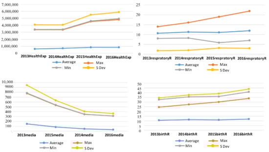 Figure 4 shows the second stage health expenditure, media report, respiratory disease, and birth rate efficiencies. Health expenditure had a significant increase after 2014, and although the average remained stable from 2015 to 2016, the maximum and standard deviations increased significantly.