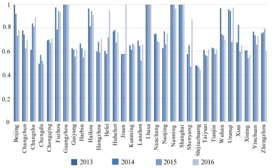 Overall efficiencies in the 31 Chinese capital cities from 2013 to 2016.