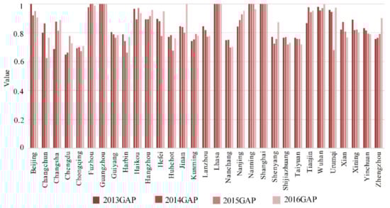 In Table 1 and Figure 5, as can be seen, there were significant efficiency differences across the cities. The best overall efficiencies over the four years were Guangzhou, Lhasa, and Shanghai. Beijing’s overall efficiency only attained 1 in 2013, and there were significant improvements needed in the other cities.