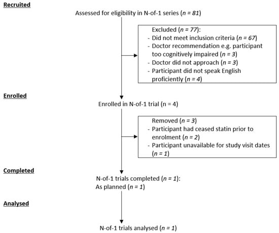 However, to generate evidence on the benefits and harms of deprescribing medications, clinical trials need to be conducted [7]. Currently, there is a lack of consensus on the most applicable trial methodology to inform the efficacy and safety of deprescribing medications [7]. N-of-1 trials can provide information in patient populations where the effects of medications on particular disease states is poorly understood [8]. For example, N-of-1 trials have been previously used to determine the optimum treatment for people with chronic diseases, such as schizophrenia, and can overcome the heterogeneity of treatment effects in these populations [9,10,11]. Inclusion of people with chronic diseases, who are generally excluded in clinical trials, appears to be safe, indicating the potential of recruitment involving older adults with cognitive impairment in N-of-1 trials [10,11]. N-of-1 trials have also been used in studying the side effects of statins, specifically, statin-related myalgia in older adults 65-years-old and above, indicating their potential for investigating the relationship between statins and other non-specific outcomes such as cognitive impairment [12]. Furthermore, deprescribing N-of-1 trials are safe and can generate strong patient-specific evidence on the benefits and harms of discontinuing medications, potentially informing and facilitating the conduct of subsequent, robust, clinical deprescribing trials [13].