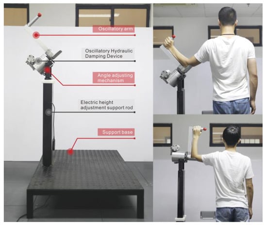 According to the size of different adults in China [18], we designed the electric support rod with height adjustable and the swing arm with the length adjustable on RCT. Before exercise, subjects can adjust the length of the swing arm and the height of the ground hydraulic damping device to make the trainer fit the ergonomic size for their own movement. The adjustment range of the swing arm length was 30–40 cm, and the height adjustment range of the oscillatory hydraulic damping device was 125–170 cm. In order to meet the need for shoulder rotation training of light resistance, medium resistance, and heavy resistance, a 12-gear knob was designed to set the exercise resistance. Each level of resistance is divided into four levels. Subjects with pre-existing rotator cuff or muscle damage can select the small resistance depending on individual condition. Moreover, the subject could also set the fixed angle of the RCT. The adjustment range was 0–90° [19], which can adapt to different shoulder rotation movements and exercise angles for the healthy or injured ones. After setting, the subject performed reciprocating shoulder rotation training.