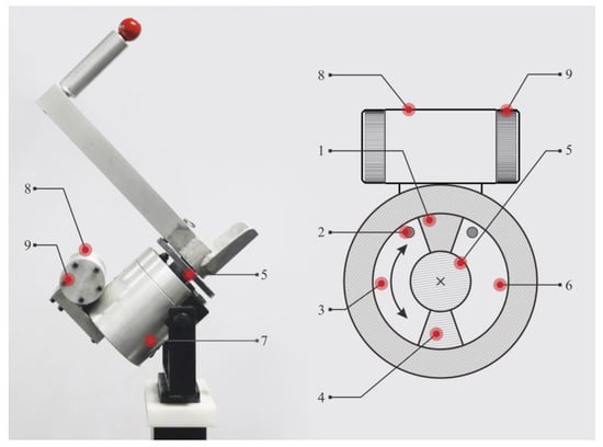 Oscillatory hydraulic damping device. 1—Fixed blade; 2—Rotating blade; 3—Rotating axis 4—Cavity 1; 5—Cavity 2; 6—Throttle; 7—Hydraulic cylinder; 8—Throttle valve; 9—Throttle controlling knob. Pictures of the experimental progress.