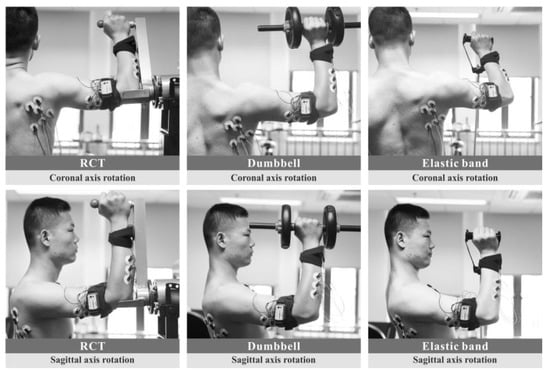After the end of all MVC tests, 20 min of rest was provided. After that, the subjects used three types of equipment: the RCT, dumbbell, and elastic band for muscle training. There were two training postures, namely the internal rotation and external rotation along the sagittal axis and the coronary axis, and the action range was 0−90°. The subjects performed the above two training actions at a uniform speed of 60°/s and 120°/s by means of metronome guidance. One task was training with an action at a rotational speed using one device, so each subject performed 12 tasks (3 devices × 2 actions × 2 angular velocities). Each task was performed in 10 groups. In order to avoid generating fatigue, a 3-min break was provided between two tasks. The experimental process is shown in Figure 3.