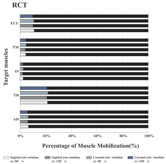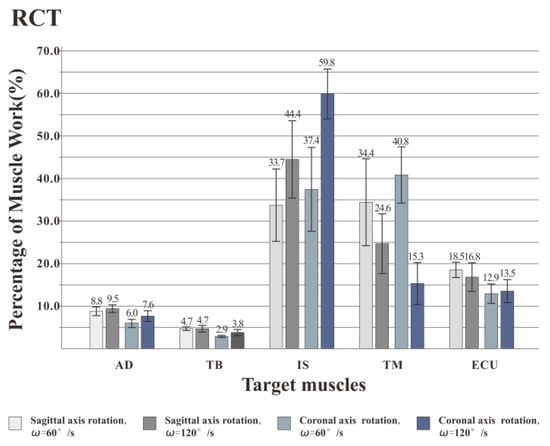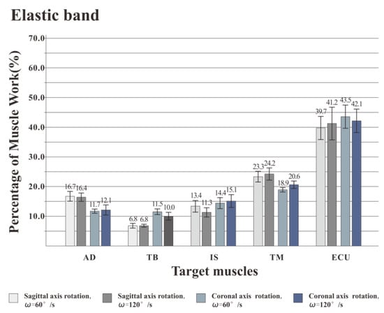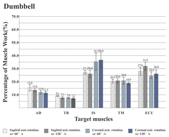Figure 7, Figure 8 and Figure 9 illustrate the percentage of total work done by all the muscles during a single exercise cycle when using different equipment for the shoulder rotation movement. Based on Figure 7, when using the RCT, the IS had the highest percentage of work, followed by TM, while TB had the least work (less than 10%). Compared with the movement speed of 60°/s, when the subjects exercised at 120°/s, the proportion of work done by IS increased significantly, while the proportion of work done by TM decreased. The difference for the other three target muscles was not evident. When the shoulder was rotated around the sagittal axis, the percentage of work done by IS was lower than that when the shoulder was rotated around the coronal axis. When the shoulder was rotated around the coronal axis, the percentage of work done by AD, TB and ECU was slightly lower than when the shoulder was rotated around the sagittal axis. When rotation around the coronal axis was performed at 60°/s, the percentage of work done by TM was higher than when rotation was around the sagittal axis, and there was a significant difference by t-test (p < 0.05). When the movement speed was 120°/s, the percentage of TM work in the sagittal axis rotation of the shoulder movement was higher than that of the coronary axis rotation, and there was a significant difference by the t-test (p < 0.05). Based on Figure 8 and Figure 9 IS was mainly used during the dumbbell task to perform the shoulder rotation movement, and IS had the highest proportion of work, followed by ECU. When the elastic belt was used for the shoulder rotation movement, the ECU had the highest work ratio, and the TM was the second.