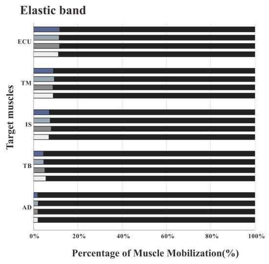 Comparing the percentage of work data of the measured muscles using the three types of equipment, the percentage of work done by IS was the highest with the RCT, the second with the dumbbell, and the lowest with the elastic band. The percentage of work done by TM was the highest with the RCT, and similar with the dumbbells and elastic bands. TB had the lowest proportion of work done among all muscles regardless of the device used, but the percentage of work done by TB was even lower when the RCT was used as compared with the other two devices.