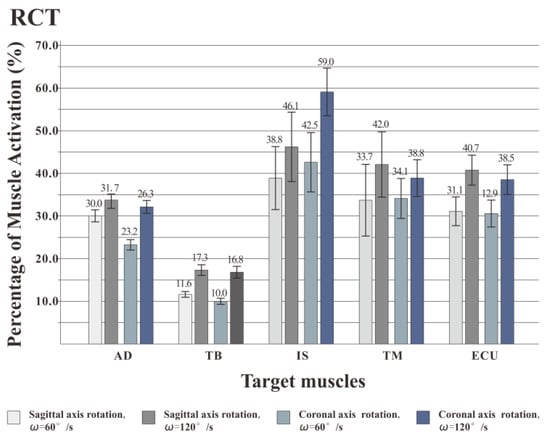 Muscle activation percentage of training by RCT. When rotated at a speed of 120°/s, the activation intensity of the muscle was significantly higher than at 60°/s. At both speeds, the IS activation intensity of rotation around the coronal axis was higher than that around the sagittal axis. The TM activation intensity in the coronal axis posture was lower than in the sagittal axis posture.