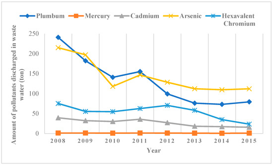 As the Chinese industrial process has rapidly developed, it has become evident that heavy metal pollution emissions are responsible for a series of potential health crises. The discharges of industrial wastewater and waste solid cause severe heavy metal pollution on drinking water sources. As early as 1956, the Japanese Minamata disease event was caused by the discharge of heavy metal polluted wastewater, which was one of eight major public hazards in the world. In China, the Guangxi cadmium river event in 2012 and Hunan cadmium rice event in 2013 had also raised concerns about heavy metal pollution (see reference [24,25]). Figure 1 shows trends of five heavy metal pollutants emissions in China. Although the overall trend of some pollutants tends to decrease, the national discharge amounts of five common heavy metal pollutants only in waste water were 79.43 ton (Lead), 1.08 ton (Mercury), 15.82 ton (Cadmium), 112.10 ton (Arsenic), and 23.598 ton (Hexavalent Chromium), respectively, in 2015.