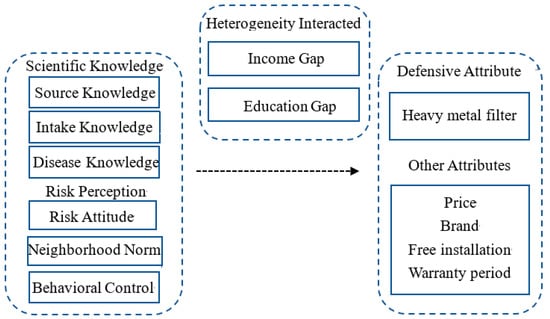 The preference for defensive attribute affected by scientific knowledge and risk perception may also interact with average income gaps and education gaps. The inherent bias of information processing and memorizing accounts for non-normative decision-makings [36]. Compared with general attitudes, risk perception also requires a better understanding of the issue [1]. Those people with better educational background and more information sources related to income level have a stronger ability to understand and analyze information [5,43]. Some studies have highlighted that education attainment is significantly associated with residents’ environmental risk awareness [31], which may help to make defensive decisions respond to heavy metal pollution risk. Higher wages are found to increase the likelihood of engaging in defensive behaviors due to their additional costs [5]. Low-income people are less aware of environmental risks [44], and rely more on their immediate social networks of family and friends rather than official information sources in response to health risks [45]. Overall, income gaps (Incgap) and education gaps (Edugap) between each respondent and average village level are utilized to illustrate the scientific knowledge and risk perception effects on the heterogeneous preferences for the defensive attribute. The specific variable definitions are shown in Table 3. Based on the above analysis, Figure 2 presents the analytical framework.