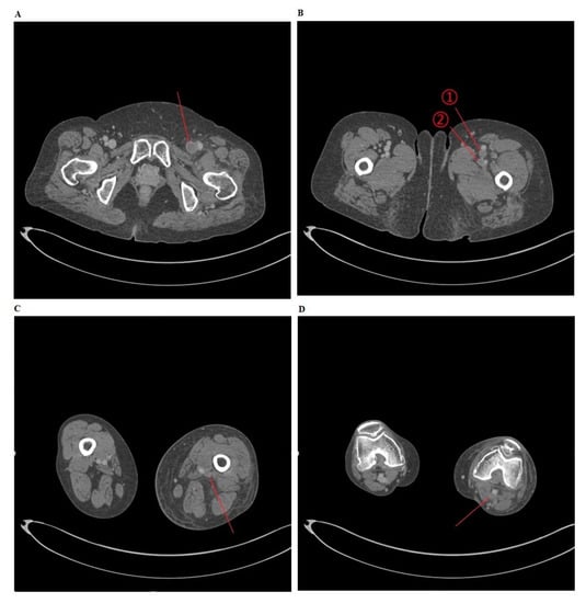 To consider the possibility of lower extremity edema arising from DVT, a CT venography was performed for (A) the common femoral vein, (B) ① the superficial femoral vein ② the deep femoral vein, (C) the popliteal vein, and (D) the popliteal vein.