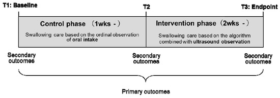 The study was conducted in Hakodate City in Japan from February to August 2018 and used a pragmatic quasi-experimental research design. The study is registered with the University Hospital Medical Information Network Clinical Trials Registry, number UMIN000035140. After more than 1 week of administering conventional swallowing care, the new swallowing care regime comprising ultrasound-based observation of the residue in the epiglottis valley was administered for a minimum period of 2 weeks (Figure 1).