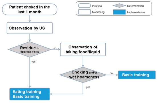 At the beginning of the intervention phase, the swallowing care regime for all the patients was planned based on the algorism (Figure 2) which adds ultrasound observation into the conventional observation. The swallowing care regime could include basic and eating training [18]. Same content of basic training was recommended for all patients in the algorism. Adding eating training was recommended by the algorism when the following signs were observed—(1) residue in the epiglottis valley observed by ultrasound, or (2) choking and/or wet hoarseness.