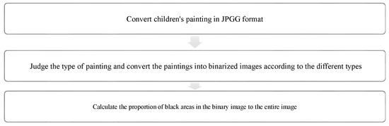 In the past, research on children’s paintings relied on the human visual system to judge them. This kind of painting evaluation method is affected by personal emotions, cultural background, living environment, and preferences, and is also influenced by personal subjective evaluation standards. However, using digital image analysis methods can reduce experimental error caused by personal subjective evaluation, as the results obtained from such methods are more objective. Paintings can be evaluated from extracted image features from the perspective of local and global features to determine visual quality [8,9]. This method can help people to simply assess the visual quality of paintings. Assessment (including, e.g., lines, color features, and composition features) involves dividing the image according to different details and then using a digital image analysis method to evaluate said details [10]. In this study, children’s paintings are converted into digital images, and an image binarization method is used to analyze the images. The analysis process of image binarization selects the best threshold in the image by using the Otsu algorithm, and then retains the image’s texture features required for research purposes [11,12], [13] (pp. 445–448). Each color in a digital image has a corresponding pixel value; the image binarization method sets the gray value of pixels in the image to 0 or 255 [14]. Using a digital image analysis method to analyze children’s paintings can help art teachers to analyze them more accurately and thus to effectively reduce experimental error.