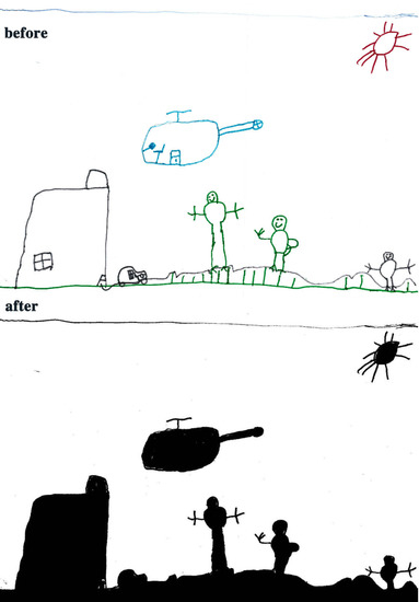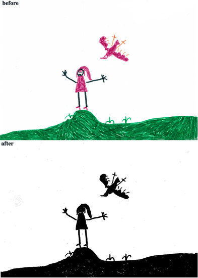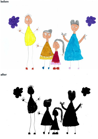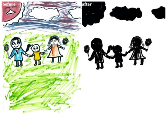 The study process of children’s paintings was divided into three steps (Figure 1). The first step was to convert children’s paintings in JPEG format. The resolution of all images used for analysis was 300 PPI. The second step was to judge the painting type and then to convert the paintings into a black and white image. The third step was to calculate the percentage of black pixels in the image as a percentage of the total number of pixels. Finally, based on the result of the calculation, it was judged whether the proportion of the subject in the child’s painting was appropriate. Before analyzing the proportion of subjects, the paintings needed to be pre-processed. Different children have different painting habits, and due to the differences in children’s composition methods and material usage habits, different composition forms will appear. Furthermore, different texture effects produced by different painting materials (such as colored pens, crayons, oil pastels, etc.) and painting papers would affect the study results; therefore, the painting materials used in children’s paintings were limited to colored pens and pencils (pencils were used for the contour lines of the objects in the paintings). The contour lines drawn with pencil were fine lines, and occupied only a small area of the entire painting. Therefore, paintings with pencils were also accepted. The papers that the children used were all white sketch paper. In order to improve the accuracy of the test, it was necessary to binarize the different types of paintings. According to the distribution of the objects in the paintings, the paintings of children who had not received painting training were divided into four types: Paintings without a background color, paintings with partial scene descriptions, paintings with lines only, and full compositions [2,48]. By sorting out children’s paintings, the following characteristics were observed: (1) Paintings without a background color (Figure 2 and Figure 3) lacked the depiction of an environment (such as the sky, clouds, sun, and background colors) and only simple characters or objects. In transforming these paintings, it was necessary to binarize the areas that represented the main content of the paintings; Figure 2 and Figure 3 show the features of this type of painting before and after image binarization. This test determined the proportion of the main content area of the painting to the overall painting work. (2) Some paintings were composed of lines. Therefore, when this type of painting was transformed, the area defined by the lines needed to be binarized. Figure 4 shows the effect of the binarization of images of this kind of painting. (3) Some paintings had a colored background (Figure 5). In this type of work, the paintings were full of color. If researchers convert an unprocessed painting to a binarized image, all of the colors in the painting will be binarized; thus, converting images in this way will affect the results of the test. Therefore, for this type of painting, the background color needed to be removed before image binarization. (4) Paintings that contained part of the background color (Figure 6) needed to have the background color removed before image binarization as it is not related to the main content of the painting.