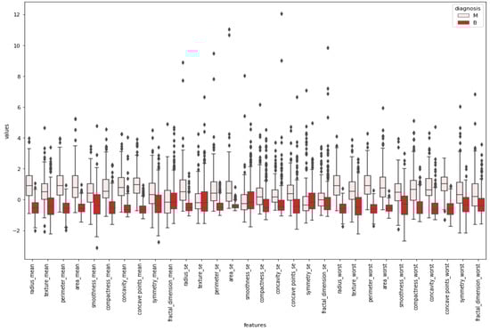 30]. The second parameter is the diagnosis of membranes, of which there are two diagnoses for tissue: malignant and benign. For different cancer types, it is necessary to determine the correct diagnosis of tissue in case both membranes have different treatments. After these two, estimated means, standard errors, and radius means indicate a range between the center and point on the perimeter. Radius se shows the estimated standard error. Radius worst has the highest value of the center for the estimated range. It is essential to know the distance between the center and the point because surgery depends on the size. There is no chance to do surgery with big tumors. Texture mean represents the standard deviation of the gray-scale values. Texture se represents the standard error of the calculated standard deviation for gray-scale values. The highest mean value of standard deviation for gray-scale values is shown as texture worst. Gray-scale is commonly used to find the tumor location, and the standard deviation is essential to find the variation of the data and to explain how to spread out the numbers. Perimeter mean represents the mean value for the core tumor, while standard error of the mean represents the core tumor described as perimeter se. The highest value of the core tumor is written on the perimeter worst column. Area mean, area se, and area worst point at similar values related to the mean of the cancer cell areas, as described before. Smoothness mean is the mean for regional variations in radius range, smoothness se represents standard error of the mean of local variations in radius length, and the largest mean value is shown as smoothness worst. Compactness mean is a mean value of estimation of the perimeter and area, compactness se is used for standard error of compactness mean, and the highest mean value of the calculation is named compactness worst. Concavity mean shows the severity of concave portions of the shape, and concave points mean is the number of concave portions of the contour. Concavity se stands for the standard error of concave portions, while concave points se stands for the standard error of the concave portions of the shape. Concavity worst and concave points worst stand for the highest mean value. Fractal dimension mean is the calculated mean value for coastline approximation, standard error of the coastline approximation is shown as fractal dimension se, and the highest mean value is fractal dimension worst [