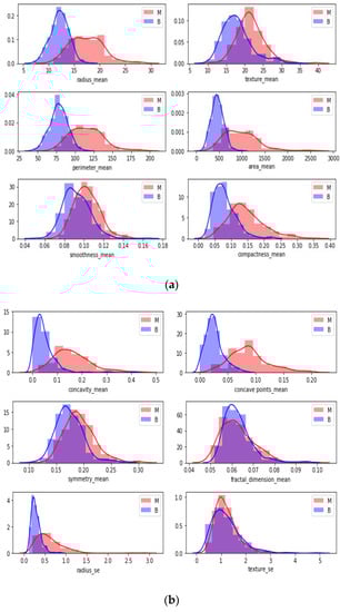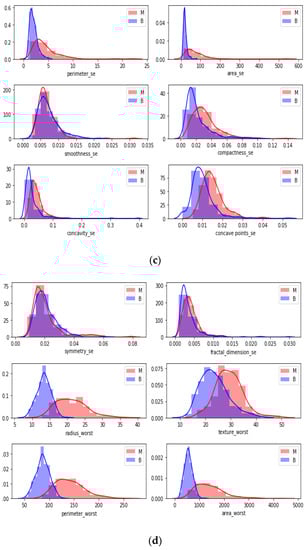 Figure 6c,d indicate a standard error and worst value of attributes. For instance, the shape of radius mean attribute distribution for a benign tumor is symmetric, while the area se attribute distribution for a malignant tumor is right-skewed. Attribute data values largely varied for some of the attributes.