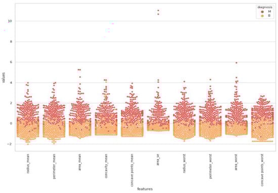 Figure 7, a detailed correlation was investigated by visualizing each individual in the data by using a swarm plot. Features were divided into two groups: uncorrelated and correlated. Uncorrelated and correlated features were two groups that showed high and low correlation features throughout the dataset. The plot indicates that the mean of data distribution was between −2 and +2.