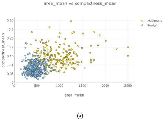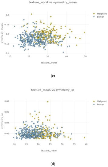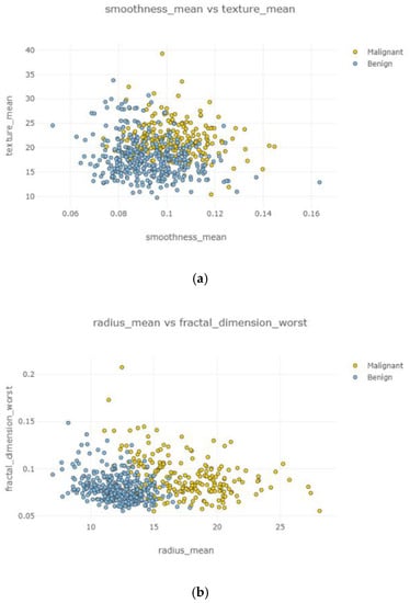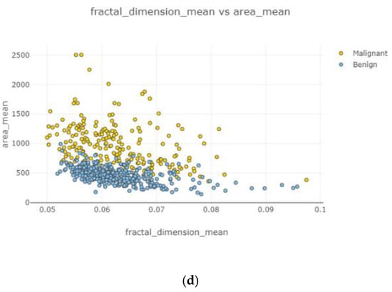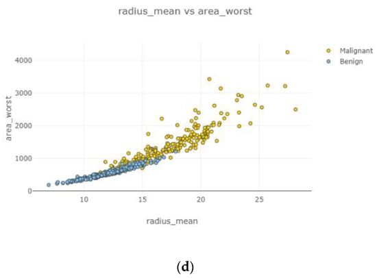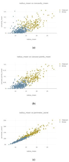 Figure 12. Under the positively correlated category, features of radius mean, concavity mean, concave points mean, perimeter worst, area worst, and compactness worst were grouped, and their graphs were plotted. Under the negatively correlated category, smoothness mean, texture mean, radius mean, fractal dimension mean, texture worst, symmetry se, symmetry mean, and the area mean were also grouped, and their graphs were represented in