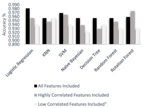 Figure 14, all accuracy result values under three feature groups and six machine learning algorithms are given. According to the experiment result, the worst scenario was a decision tree algorithm with low correlated features. Nevertheless, logistic regression with all features included provided the best accuracy result, compared to all other scenarios, with 98.1%. All test accuracy results of all features were 98.1%, 96.9%, 95.9%, 95.6%, 95.6%, and 95.6% from best to worst respectively. Highly correlated test accuracy results were 97.4%, 96.5%, 95.6%, 94.7%, 94.7%, 93.8%, and 93.0% from best to worst respectively. Low correlated test accuracy results were 95.6%, 93.9%, 93.9%, 93.9%, 93.0%, 93.0%, and 92.1% from best to worst respectively.