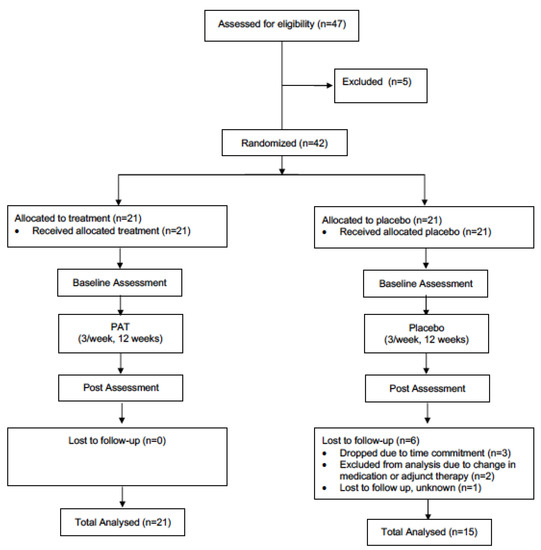 The present study utilized a double-blind, parallel-group, randomized controlled trial design. All individuals with PD interested in participating in the study, and who fitted the inclusion criteria, were asked to visit the Movement Disorders Research and Rehabilitation Centre (MDRRC) one week prior to the scheduled start-date of the exercise program for assessment with primary and secondary outcome measures (pre-assessment). After pre-assessment was concluded, participants were randomized (via computerized randomization conducted by the MDRRC laboratory coordinator) into either the treatment group or the placebo group. A total of 47 patients were initially recruited to be participants. Two participants from the treatment group dropped out of the study due to the time commitment, while three participants were excluded from analysis for failing to adequately follow the intended treatment protocol. The placebo group saw three participants drop out of the study due to the time commitment and personal reasons; meanwhile, two other participants’ data was excluded from analysis due to an undisclosed change in medication or adjunct therapy partaken in during the trial period. Another was lost to follow up for undisclosed reasons. Thus, complete data was gathered from twenty-one participants in the treatment group and fifteen participants in the placebo group (thirty-six in total, Figure 1). The mean participant age (± SD) was 69.4 ± 9.5 years, and the mean duration of the disease (± SD) was 6.5 ± 4.4. A diagnosis of PD was established by the participant’s primary care neurologist. Individuals with dementia or other neurological disorders impairing gait and/or motor coordination were not admitted to the study. Participants were required to complete 12 weeks of vibration therapy. In an attempt to control for changes over the study period, participants were instructed to not change their medication regime, as well as to maintain their current levels of physical activity, and not to engage in any new therapies for the duration of the study. Participants were randomly allocated to either the treatment or placebo group via an electronic number generator. Both groups were not significantly different (p < 0.05) at baseline in age or motor symptom severity (measured by UPDRS-III [32]). This study was approved by the research ethics board at Wilfrid Laurier University, and all participants signed informed consent statements prior to partaking in research (The code is # 4291).