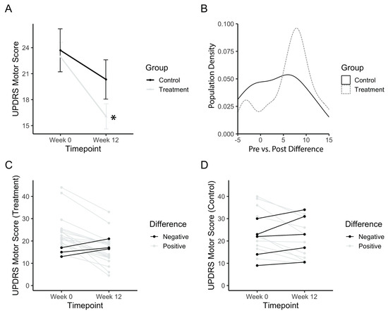 UPDRS motor score after PAT. (a) Mean motor score before (Week 0) and after long-term treatment (Week 12). (b) Population density graph of the treatment and control group plotted based on the difference in pre- vs. post-treatment UPDRS scores. Numbers represent the value of the difference between pre-PAT score by post-PAT score. A positive difference indicates a decrease in UPDRS score, and an improvement in symptoms. The population density is the percentage of the total population with the corresponding difference score. (c) Individual plots for UPDRS scores for the treatment group. (d) Individual plots for UPDRS scores for the control group. Error bars represent standard error. Asterisks indicate a significant change (p < 0.05). Higher values in scores indicate greater disability.