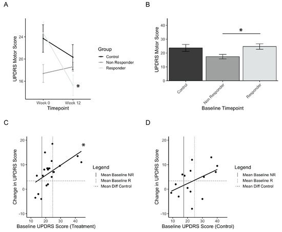 Treatment responders to PAT. (a) Mean UPDRS scores before (Week 0) and after (Week 12) treatment, grouped by responder and non-responder status. (b) Initial baseline UPDRS values for responders, non-responders, and control (placebo) groups. (c) Correlation plot of the treatment group measuring the relationship between baseline UPDRS and change in UPDRS after treatment. (d) Correlation plot of the control group measuring the relationship between baseline UPDRS and change in UPDRS after treatment. Error bars represent standard error. Asterisks represent significant changes (p < 0.05). Higher values in scores indicate greater disability.