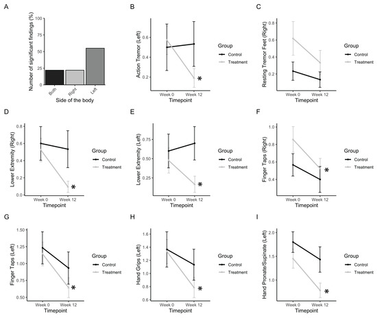 First, the subscores, including action and resting tremor as well as motor symptoms regarding the movement of extremities, were analysed (Figure 5). Out of nine subscores, which included both left and right sides, five (55%) included significant improvements in left-sided extremities (Figure 5B), which is consistent with participants reporting greater severity of symptoms in their left side prior to PAT. Action tremor in the left side was found to be significantly affected (Finteraction(1,34) = 4.47, p = 0.035). The treatment group significantly improved (p(b3) = 0.0178), whereas the control group did not (Figure 5B). Resting tremor in the right foot was found to be slightly significantly affected (Ftimepoint(1,34) = 4.065, p = 0.52). The treatment group improved, whereas the control group did not (Figure 5C). Rigidity in the lower extremities was found to be affected in both the left and right side (Fleft, interaction(1,34) = 3.36, p = 0.075; Fright, timepoint(1,34) = 5.18, p = 0.0.0292). Post-hoc analysis showed that the treatment group significantly improved by post-test in both the right side and left side (p(b3 left) = 0.0432; p(b3 right) = 0.0155) whereas the control group did not (Figure 5D,E).